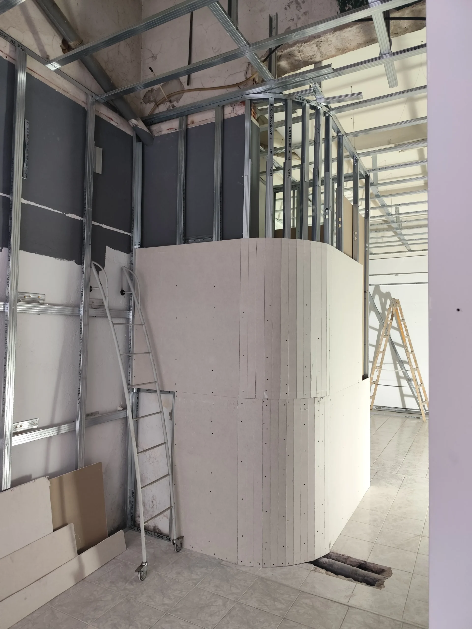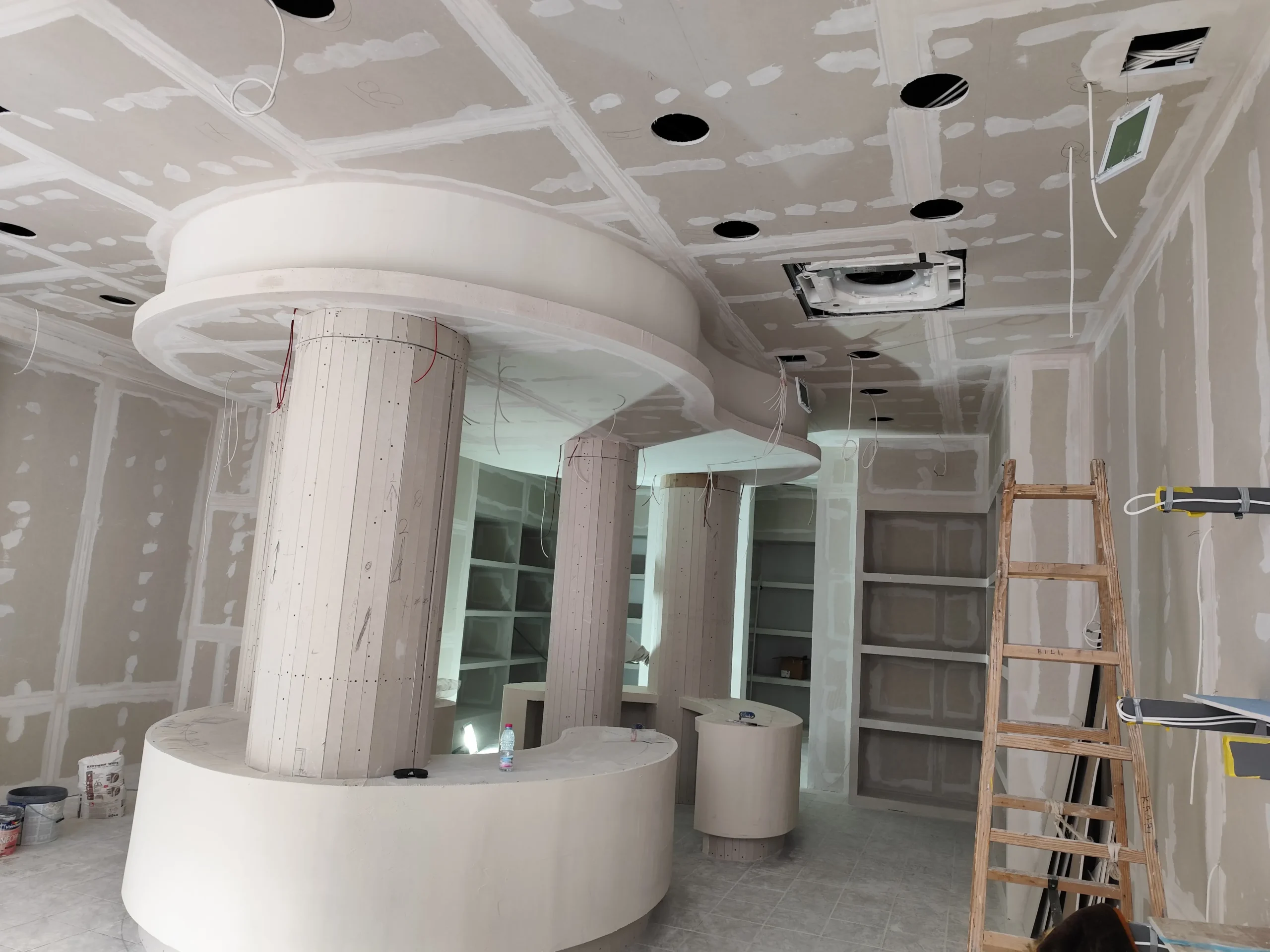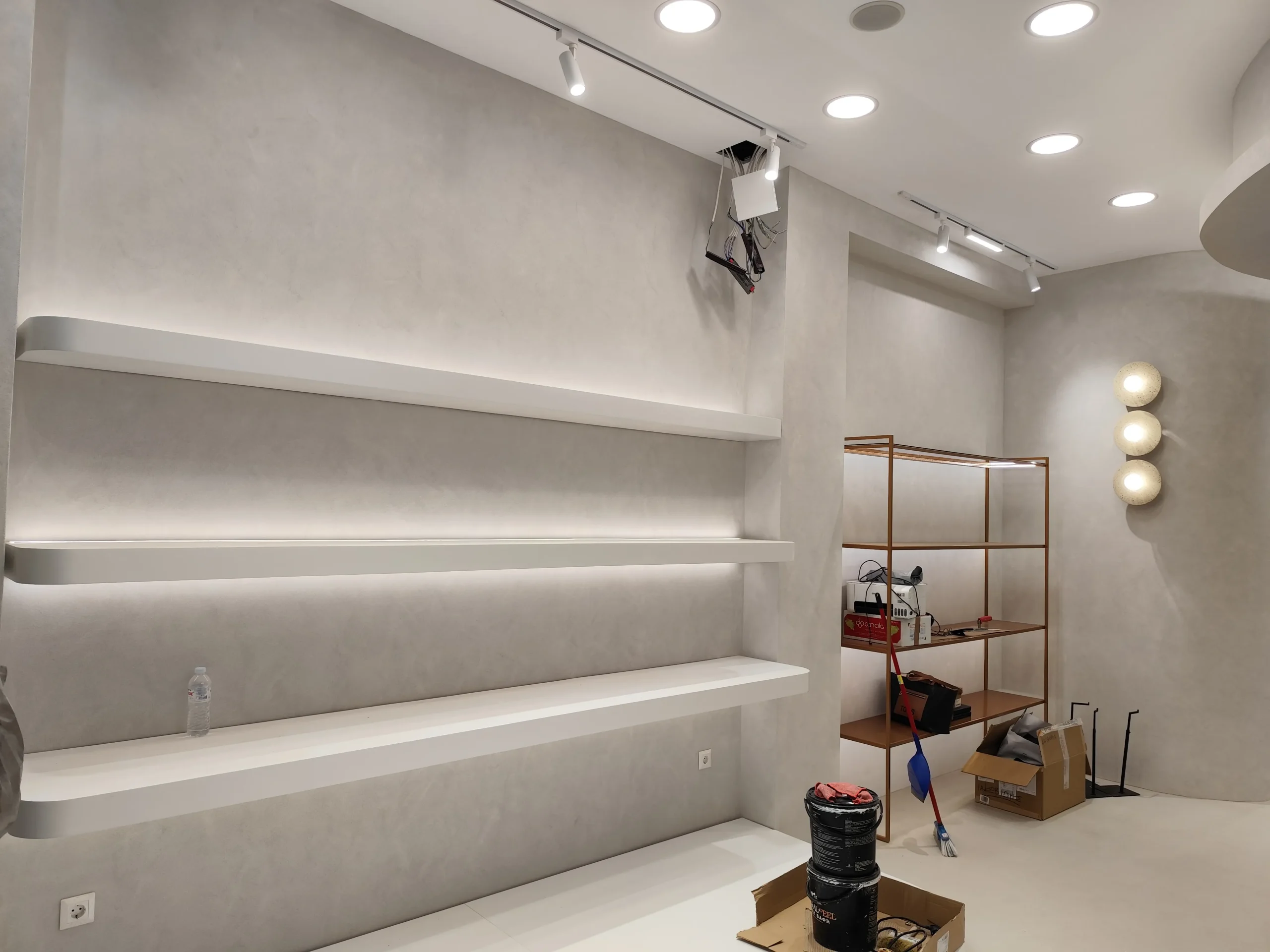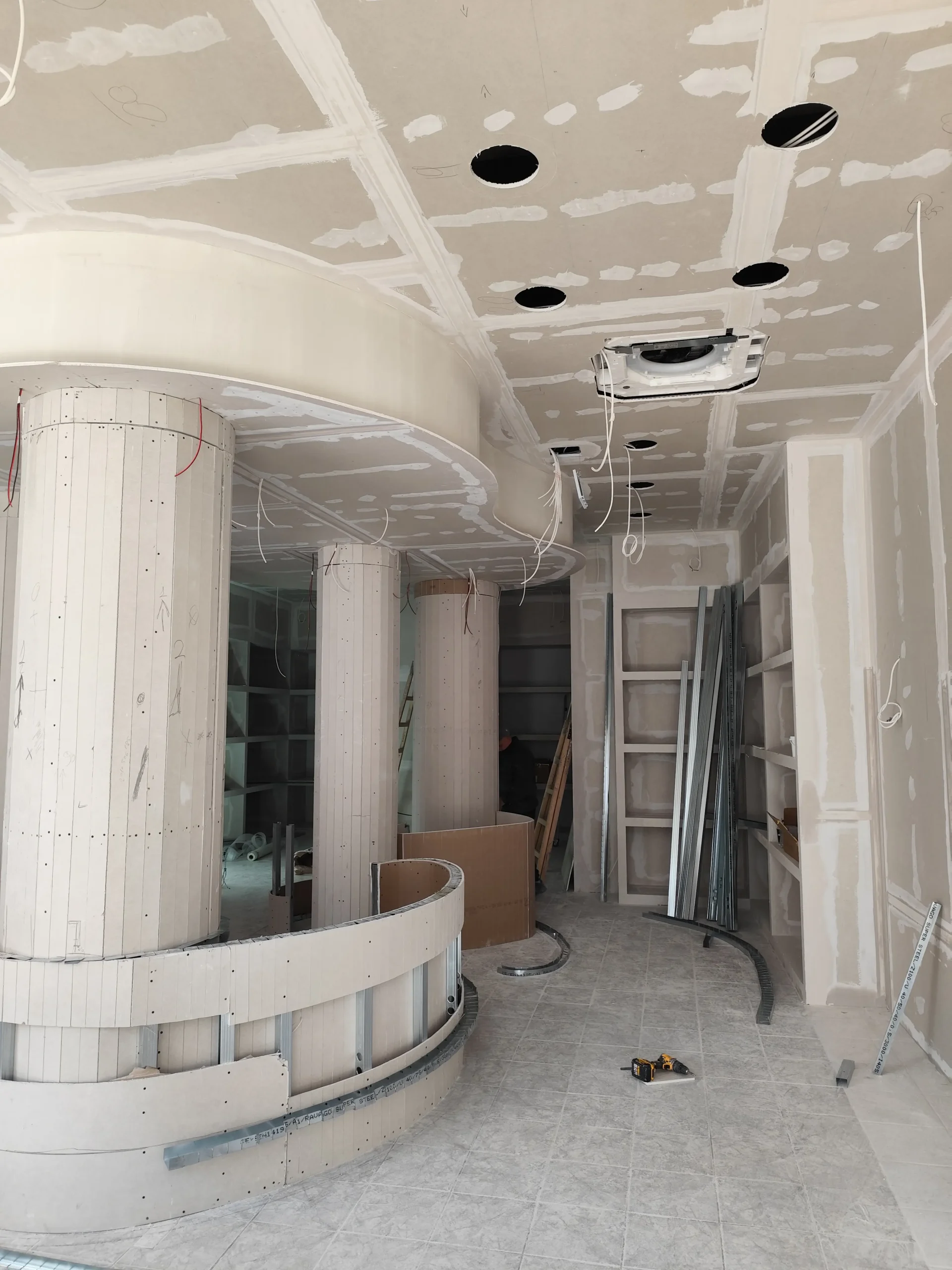 Δημιουργία του νέου καταστήματος υποδημάτων, με την κατασκευή από γυψοσανίδα να δίνει ήδη σχήμα στον χώρο. Οι εξειδικευμένες εργασίες περιλαμβάνουν την επένδυση των τοίχων και τη διαμόρφωση της οροφής με έτοιμες υποδοχές για τον φωτισμό. Ιδιαίτερη έμφαση δίνεται στην κυκλική κολόνα, η οποία αποτελεί κεντρικό αρχιτεκτονικό στοιχείο του σχεδιασμού. Το δάπεδο προετοιμάζεται για την τελική εφαρμογή πατητής τσιμεντοκονίας, προσδίδοντας ένα σύγχρονο και ενιαίο αισθητικό αποτέλεσμα. Η προσοχή στη λεπτομέρεια εγγυάται ένα λειτουργικό και κομψό περιβάλλον για την έκθεση των προϊόντων.