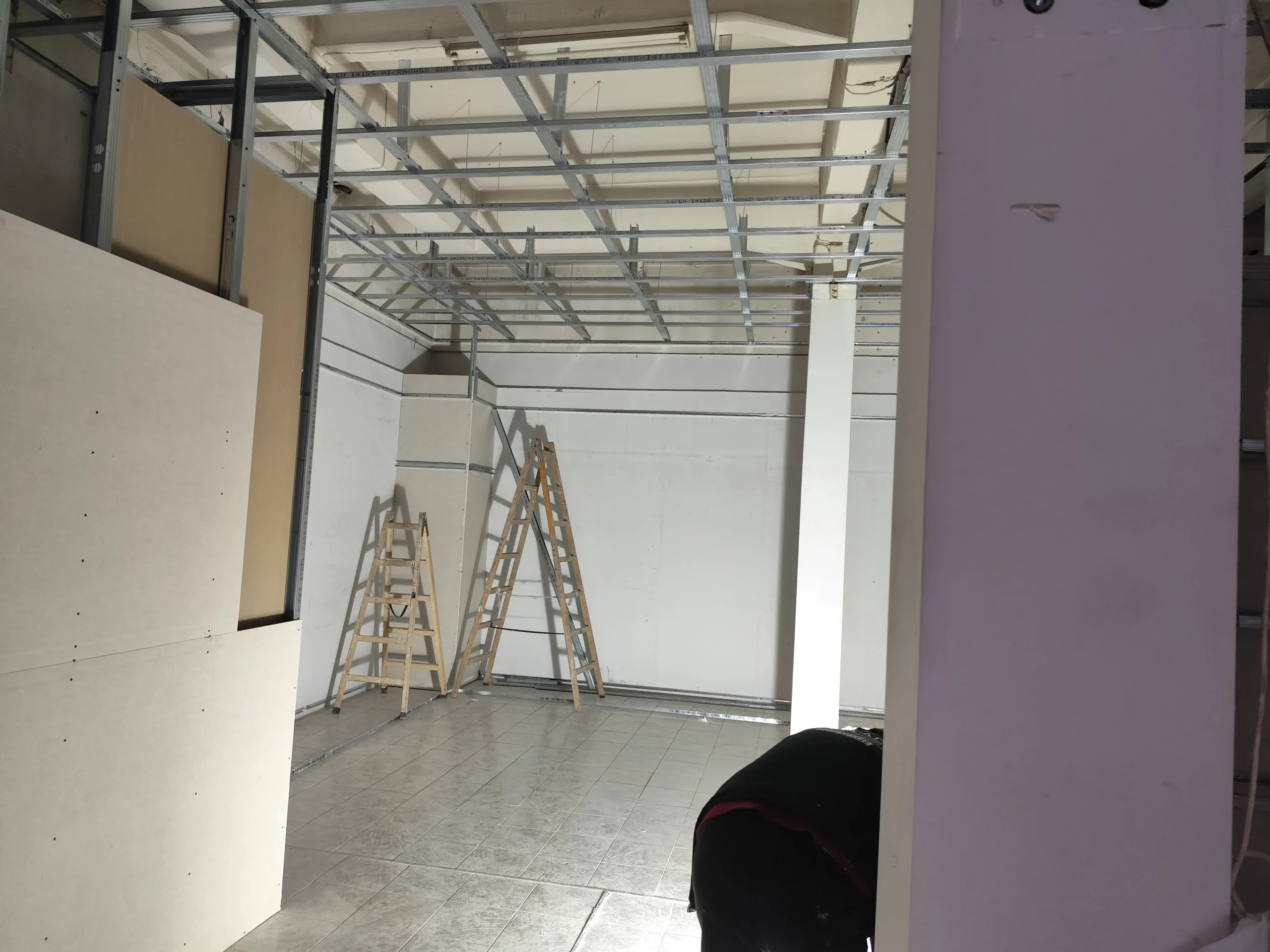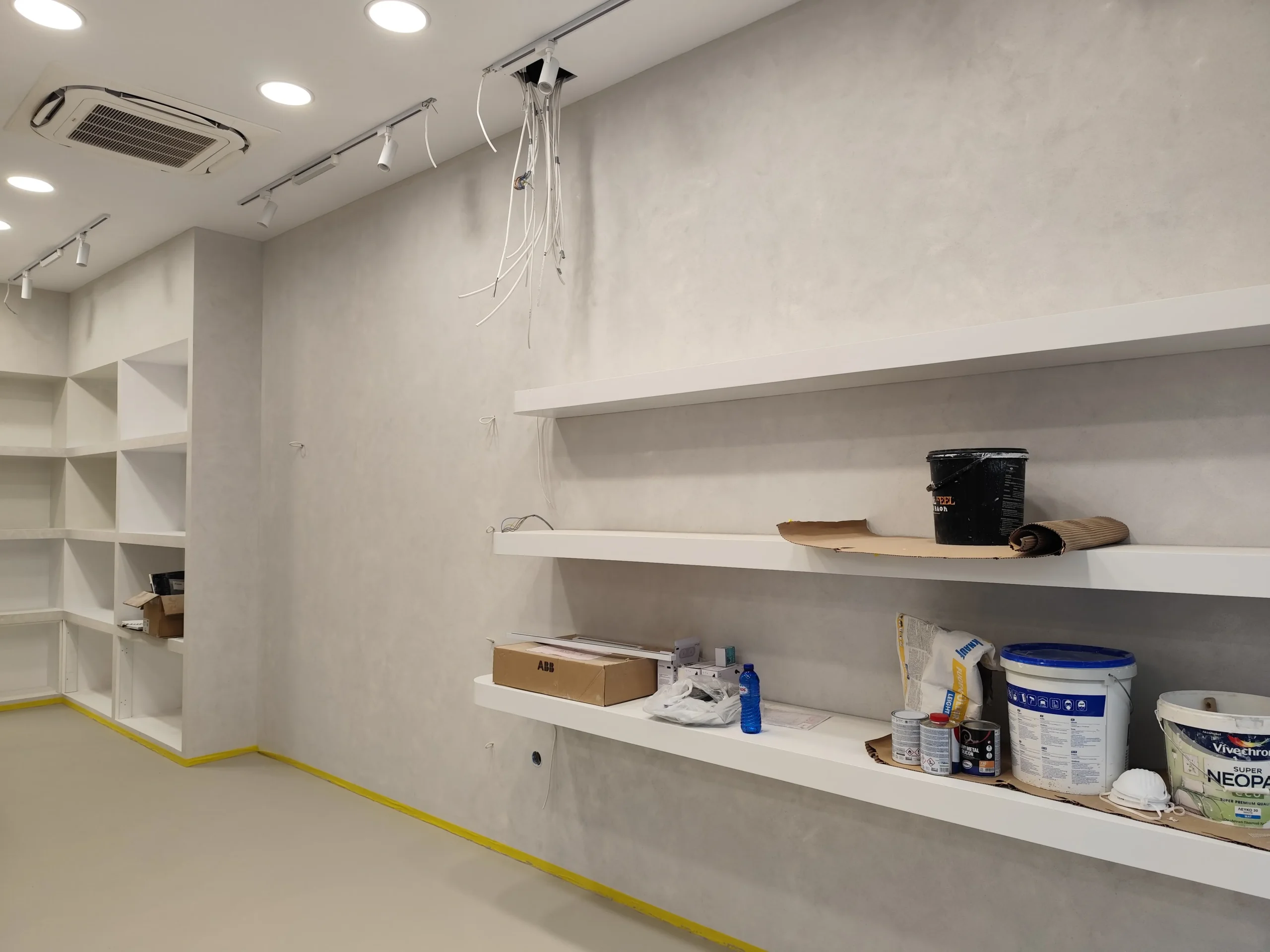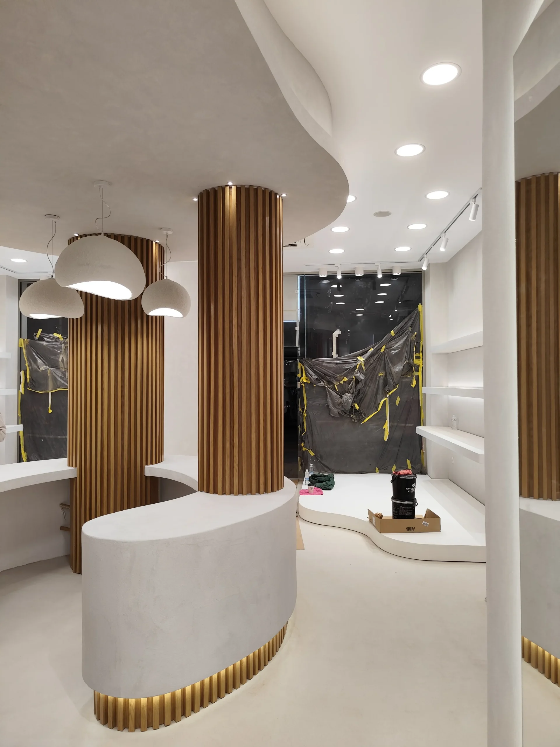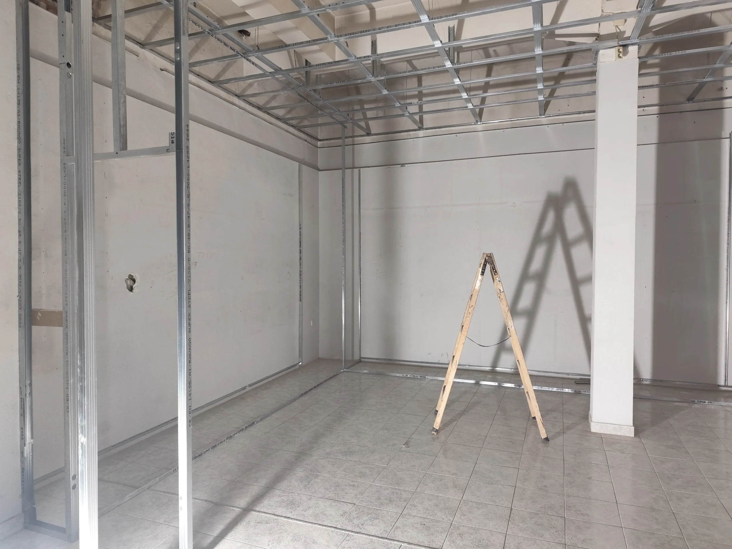 Δημιουργία του νέου καταστήματος υποδημάτων, με την κατασκευή από γυψοσανίδα να δίνει ήδη σχήμα στον χώρο. Οι εξειδικευμένες εργασίες περιλαμβάνουν την επένδυση των τοίχων και τη διαμόρφωση της οροφής με έτοιμες υποδοχές για τον φωτισμό. Ιδιαίτερη έμφαση δίνεται στην κυκλική κολόνα, η οποία αποτελεί κεντρικό αρχιτεκτονικό στοιχείο του σχεδιασμού. Το δάπεδο προετοιμάζεται για την τελική εφαρμογή πατητής τσιμεντοκονίας, προσδίδοντας ένα σύγχρονο και ενιαίο αισθητικό αποτέλεσμα. Η προσοχή στη λεπτομέρεια εγγυάται ένα λειτουργικό και κομψό περιβάλλον για την έκθεση των προϊόντων.