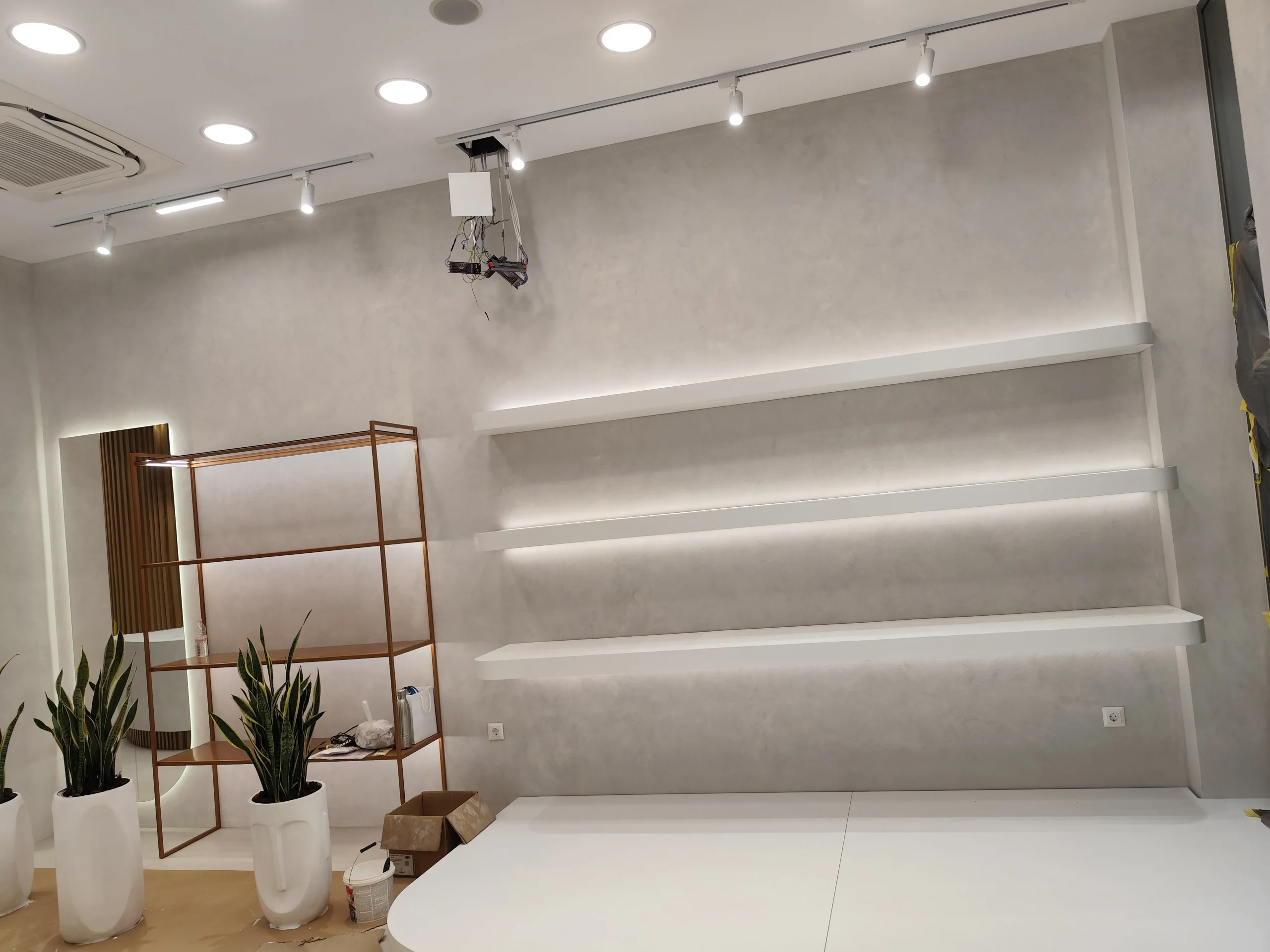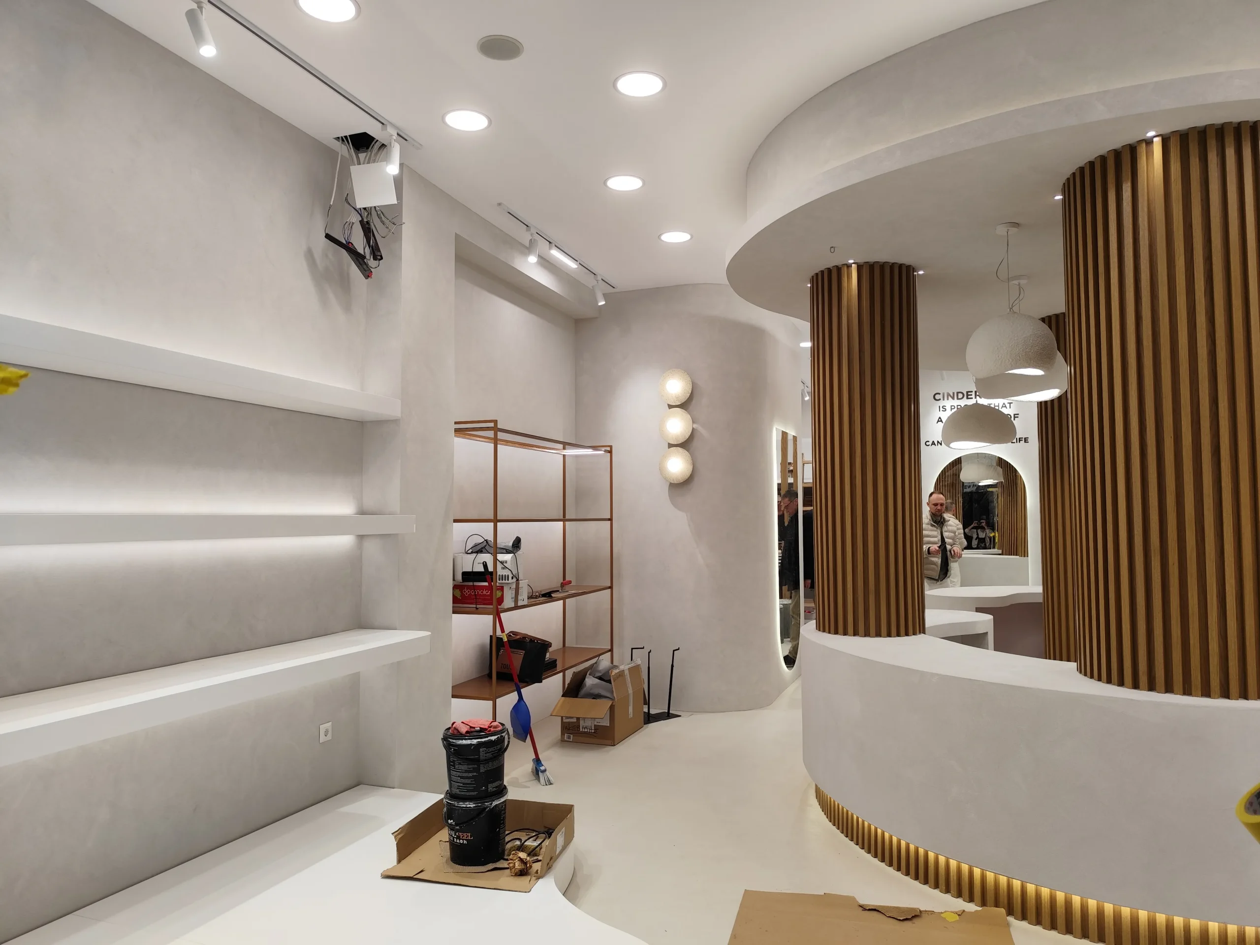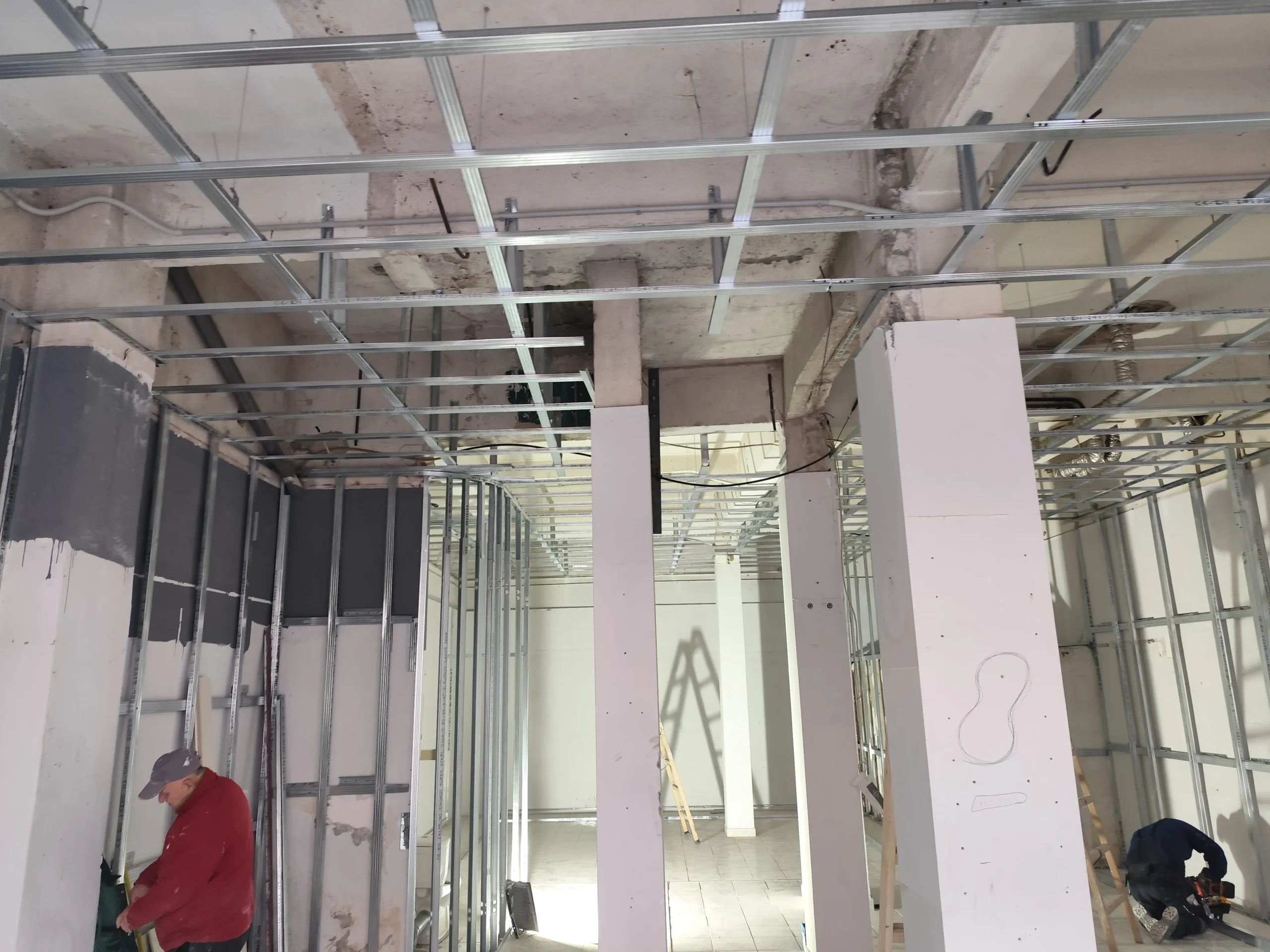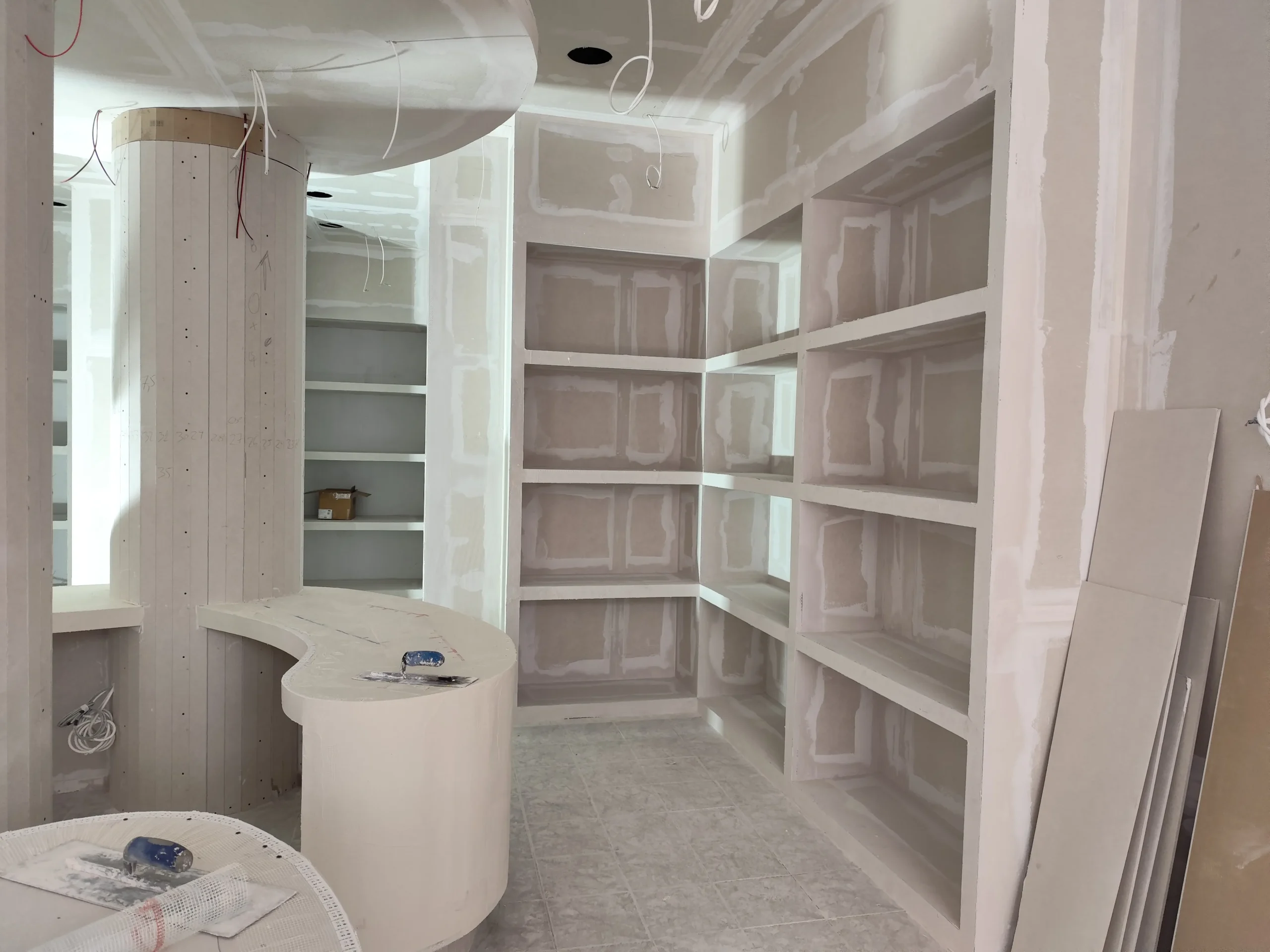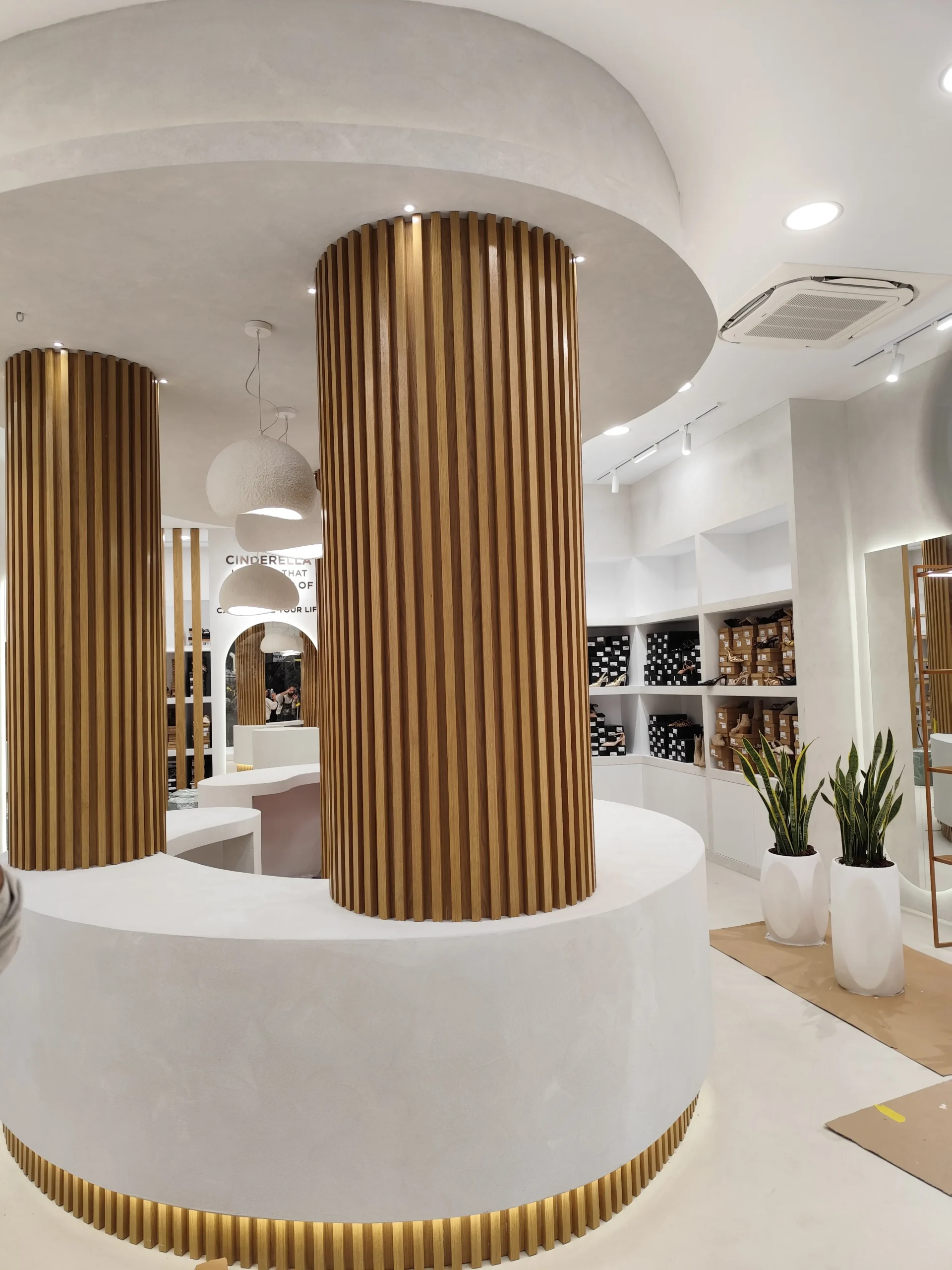 Δημιουργία του νέου καταστήματος υποδημάτων, με την κατασκευή από γυψοσανίδα να δίνει ήδη σχήμα στον χώρο. Οι εξειδικευμένες εργασίες περιλαμβάνουν την επένδυση των τοίχων και τη διαμόρφωση της οροφής με έτοιμες υποδοχές για τον φωτισμό. Ιδιαίτερη έμφαση δίνεται στην κυκλική κολόνα, η οποία αποτελεί κεντρικό αρχιτεκτονικό στοιχείο του σχεδιασμού. Το δάπεδο προετοιμάζεται για την τελική εφαρμογή πατητής τσιμεντοκονίας, προσδίδοντας ένα σύγχρονο και ενιαίο αισθητικό αποτέλεσμα. Η προσοχή στη λεπτομέρεια εγγυάται ένα λειτουργικό και κομψό περιβάλλον για την έκθεση των προϊόντων.