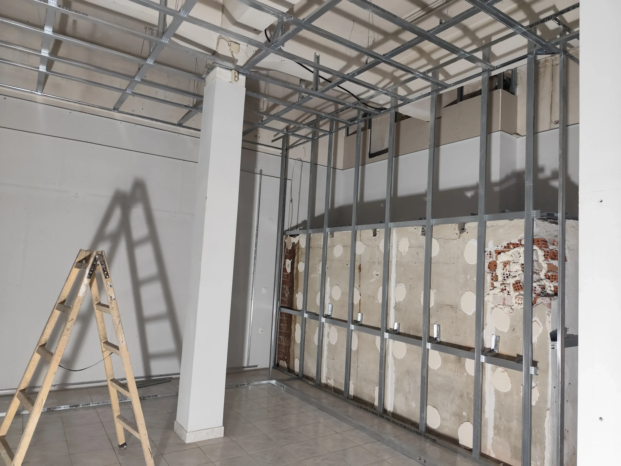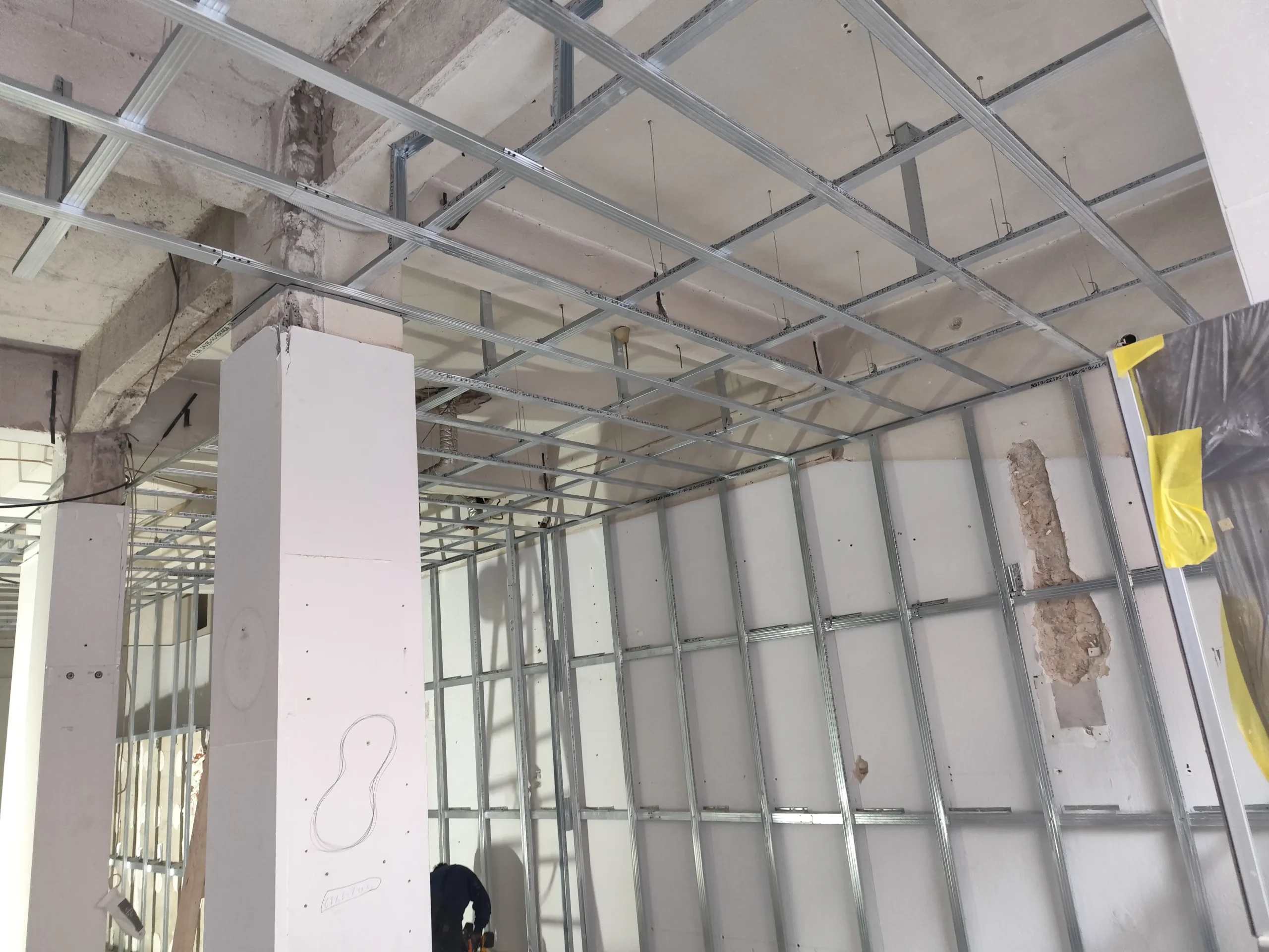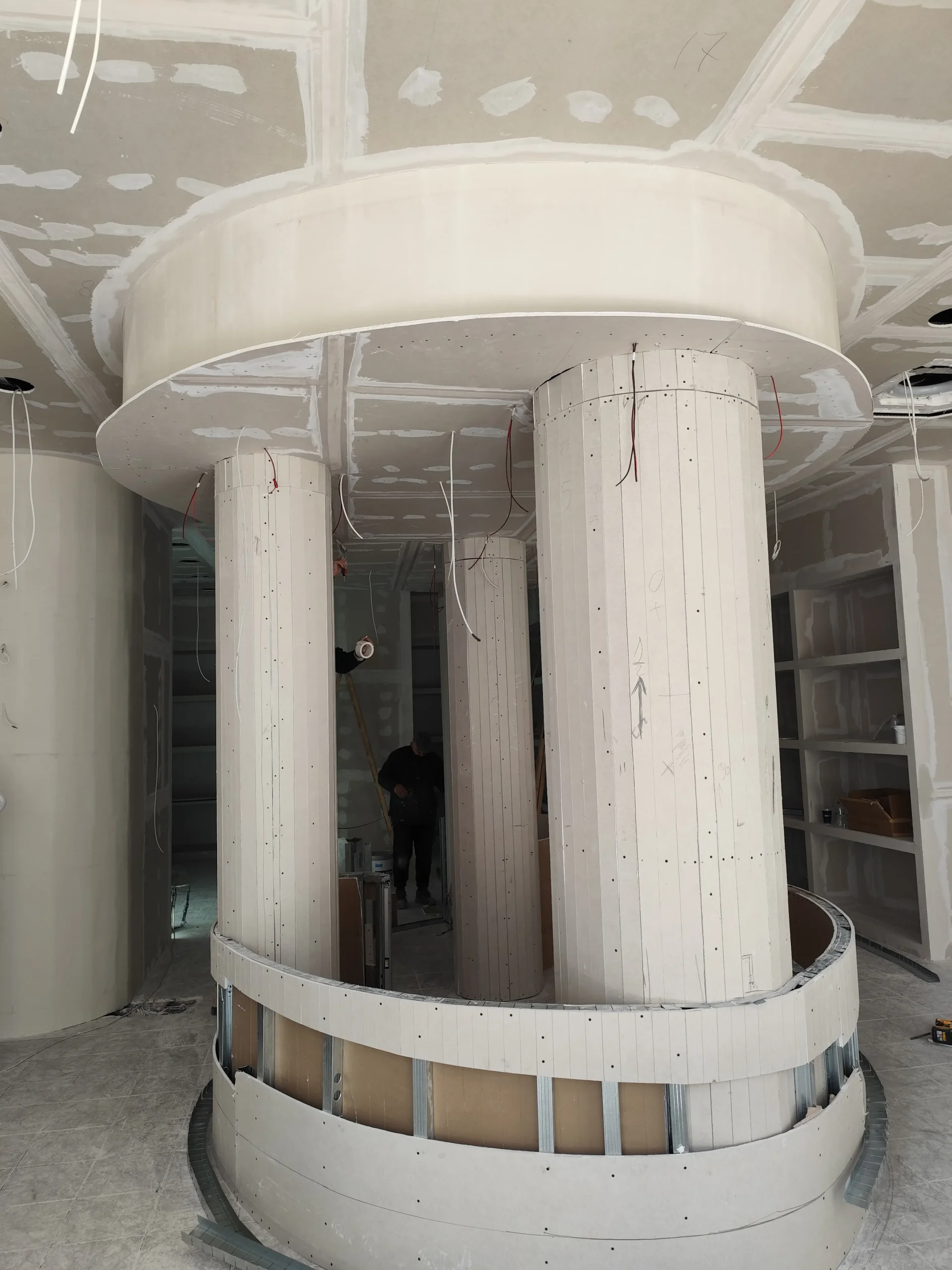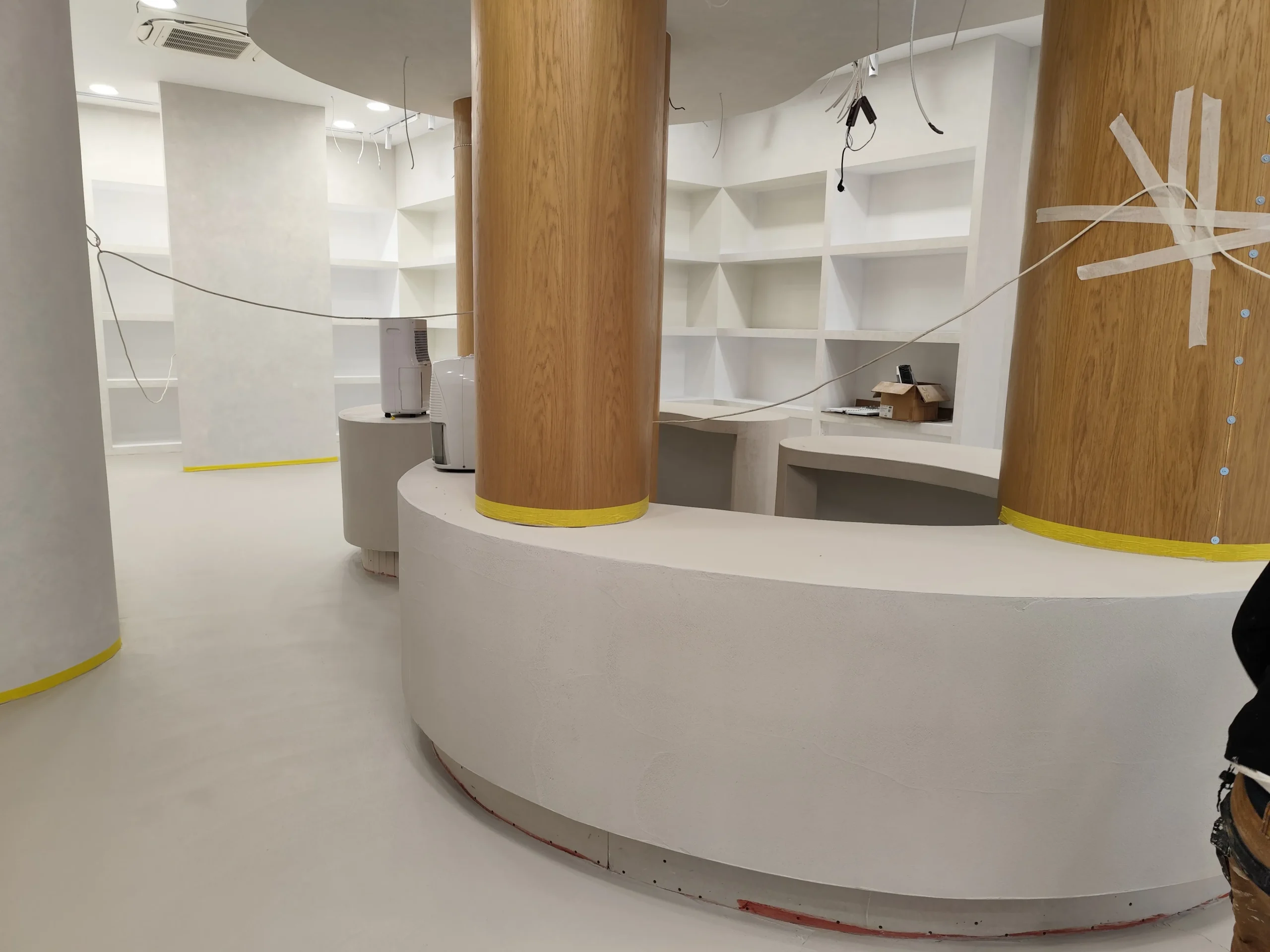 Δημιουργία του νέου καταστήματος υποδημάτων, με την κατασκευή από γυψοσανίδα να δίνει ήδη σχήμα στον χώρο. Οι εξειδικευμένες εργασίες περιλαμβάνουν την επένδυση των τοίχων και τη διαμόρφωση της οροφής με έτοιμες υποδοχές για τον φωτισμό. Ιδιαίτερη έμφαση δίνεται στην κυκλική κολόνα, η οποία αποτελεί κεντρικό αρχιτεκτονικό στοιχείο του σχεδιασμού. Το δάπεδο προετοιμάζεται για την τελική εφαρμογή πατητής τσιμεντοκονίας, προσδίδοντας ένα σύγχρονο και ενιαίο αισθητικό αποτέλεσμα. Η προσοχή στη λεπτομέρεια εγγυάται ένα λειτουργικό και κομψό περιβάλλον για την έκθεση των προϊόντων.