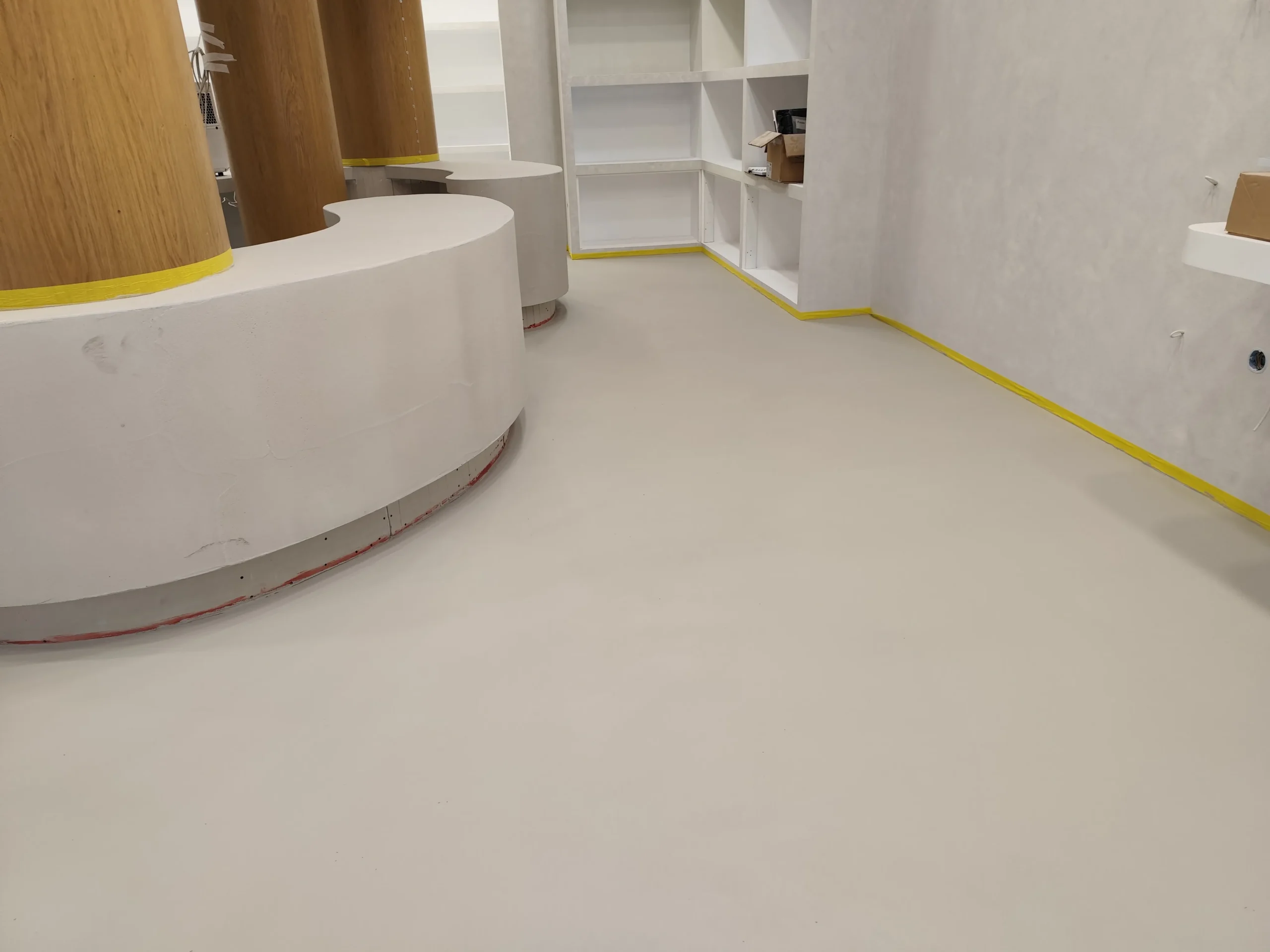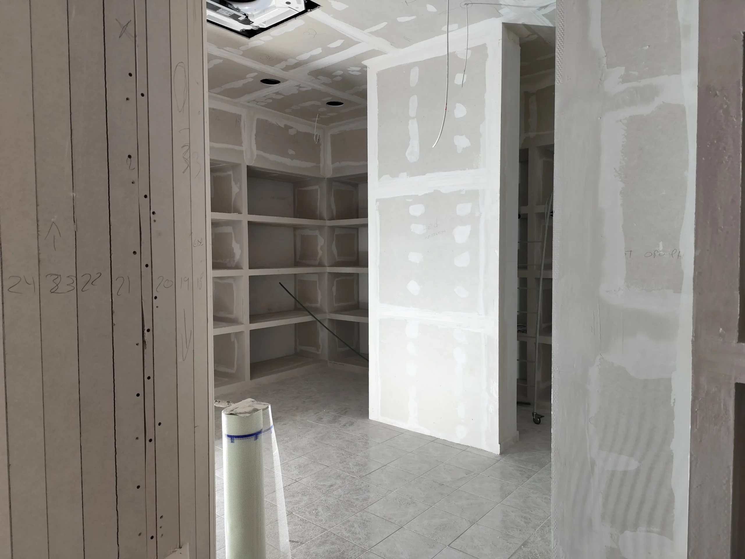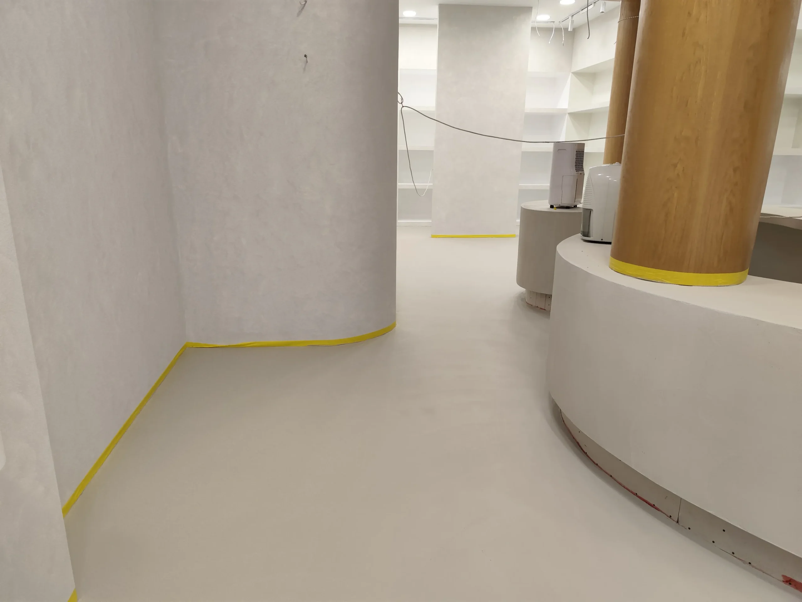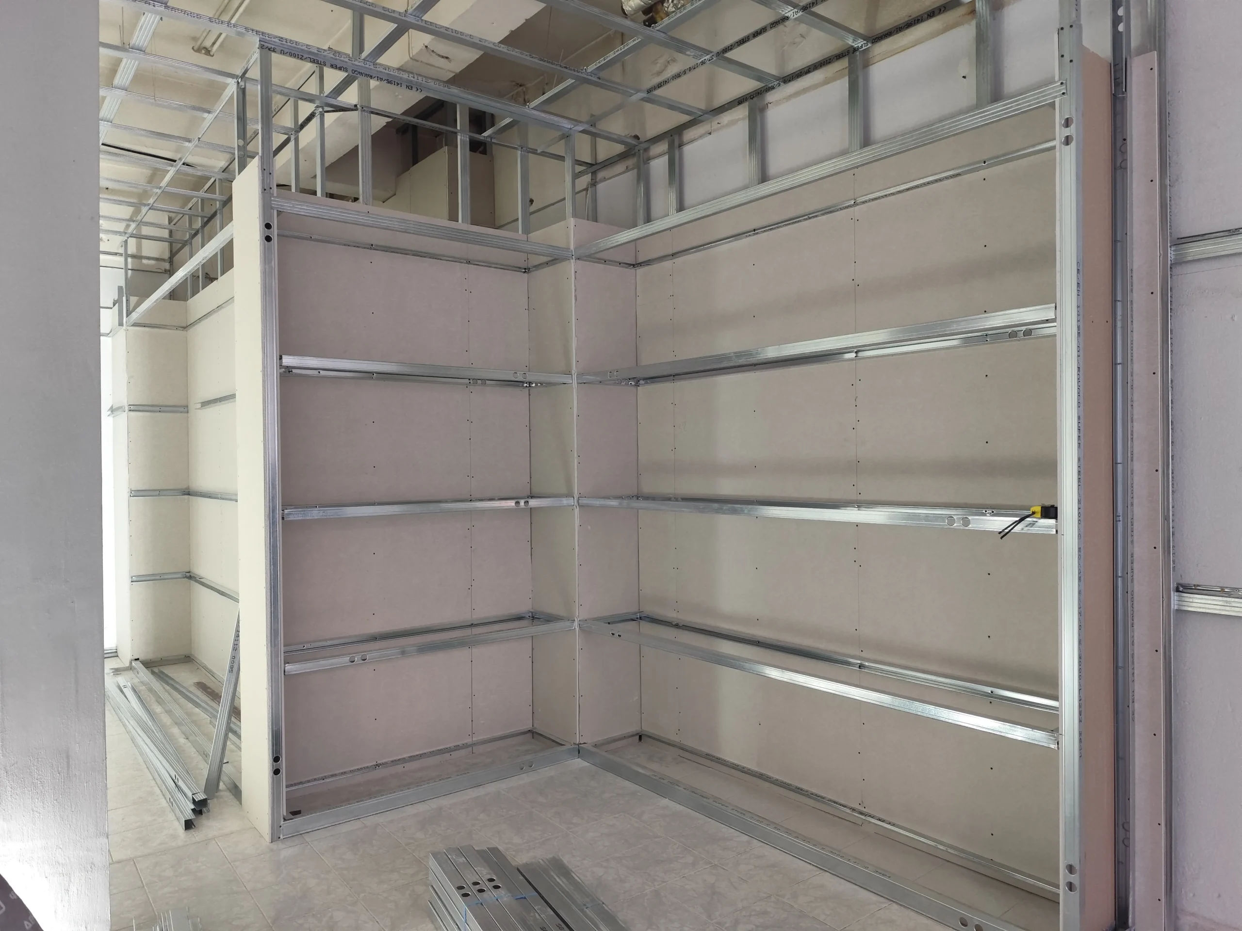 Δημιουργία του νέου καταστήματος υποδημάτων, με την κατασκευή από γυψοσανίδα να δίνει ήδη σχήμα στον χώρο. Οι εξειδικευμένες εργασίες περιλαμβάνουν την επένδυση των τοίχων και τη διαμόρφωση της οροφής με έτοιμες υποδοχές για τον φωτισμό. Ιδιαίτερη έμφαση δίνεται στην κυκλική κολόνα, η οποία αποτελεί κεντρικό αρχιτεκτονικό στοιχείο του σχεδιασμού. Το δάπεδο προετοιμάζεται για την τελική εφαρμογή πατητής τσιμεντοκονίας, προσδίδοντας ένα σύγχρονο και ενιαίο αισθητικό αποτέλεσμα. Η προσοχή στη λεπτομέρεια εγγυάται ένα λειτουργικό και κομψό περιβάλλον για την έκθεση των προϊόντων.
