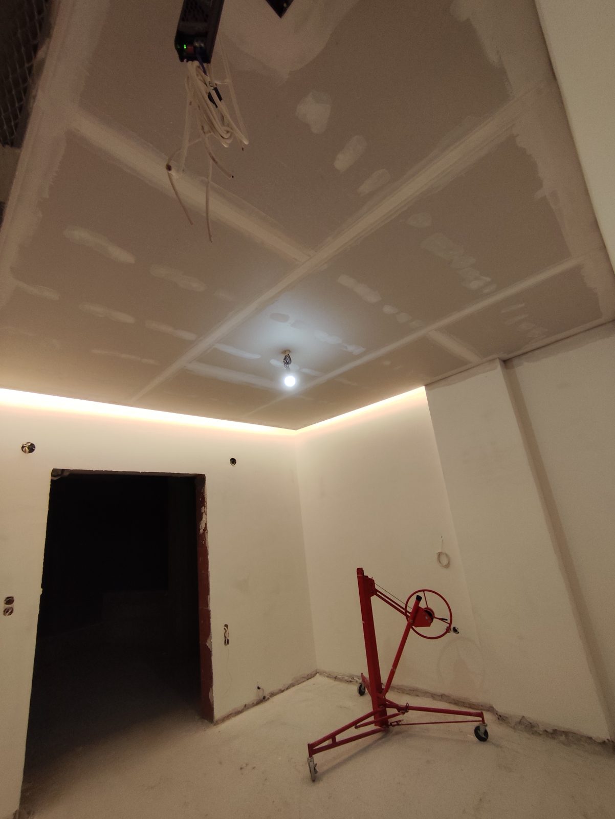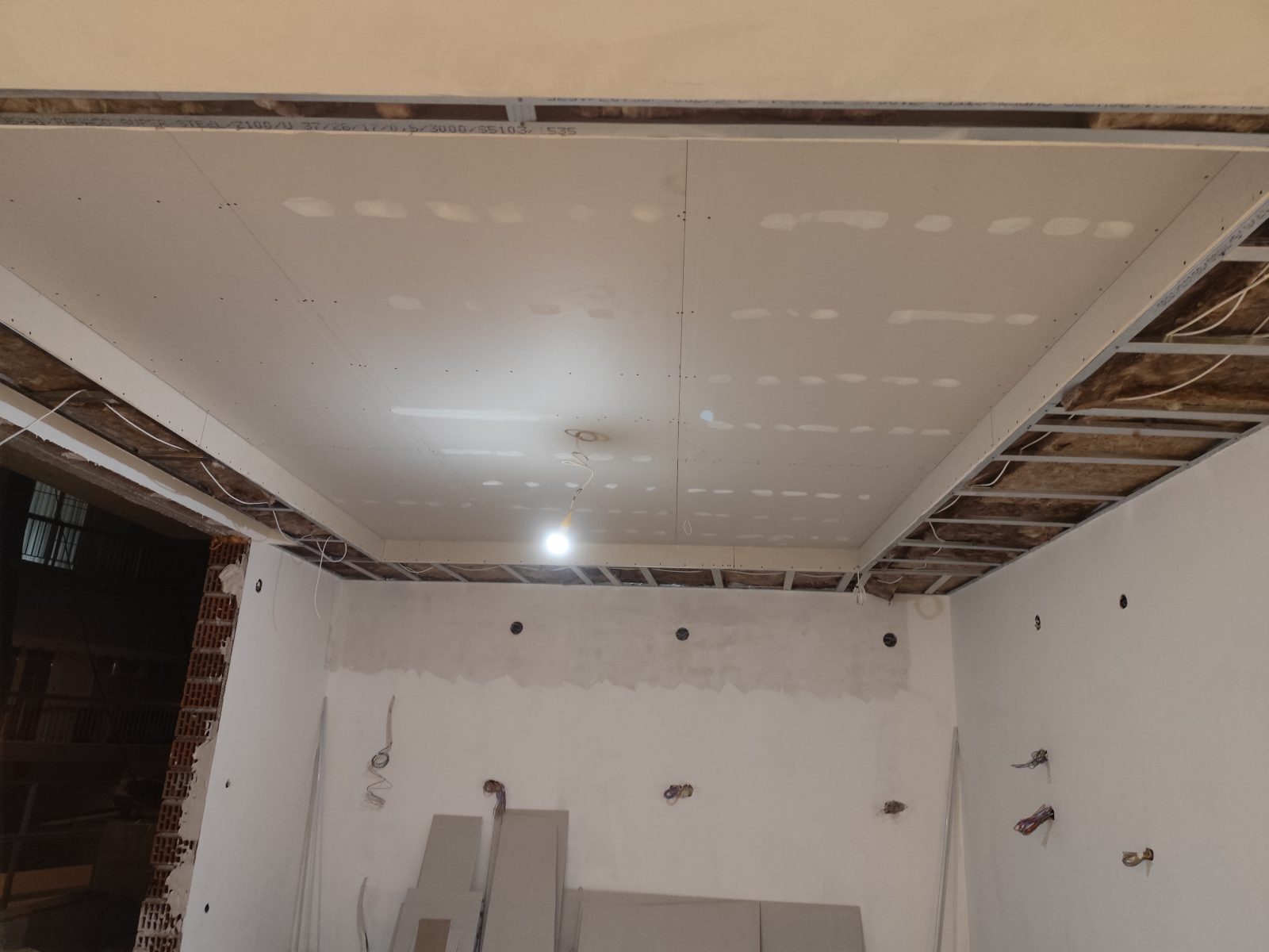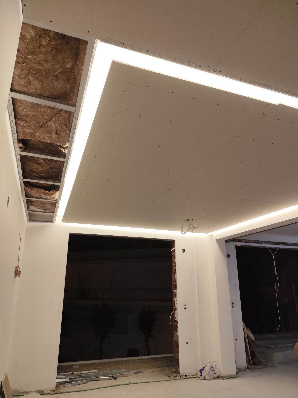 Η τοποθέτηση γυψοσανίδας στην οροφή αποτελεί την ιδανική λύση για να δημιουργήσετε εντυπωσιακά επίπεδα με κρυφό φωτισμό. Ο μεταλλικός σκελετός προσφέρει απόλυτη επιπεδότητα, ενώ η δυνατότητα προσθήκης μονωτικού υλικού (όπως ο πετροβάμβακας) στο εσωτερικό της κατασκευής βελτιώνει κατακόρυφα τη θερμομόνωση και την ηχομόνωση του δωματίου. Είναι μια καθαρή και γρήγορη διαδικασία που μεταμορφώνει την αισθητική του χώρου, προσφέροντας ένα ομοιόμορφο και σύγχρονο αποτέλεσμα χωρίς τα βάρη και την αναστάτωση των παραδοσιακών υλικών